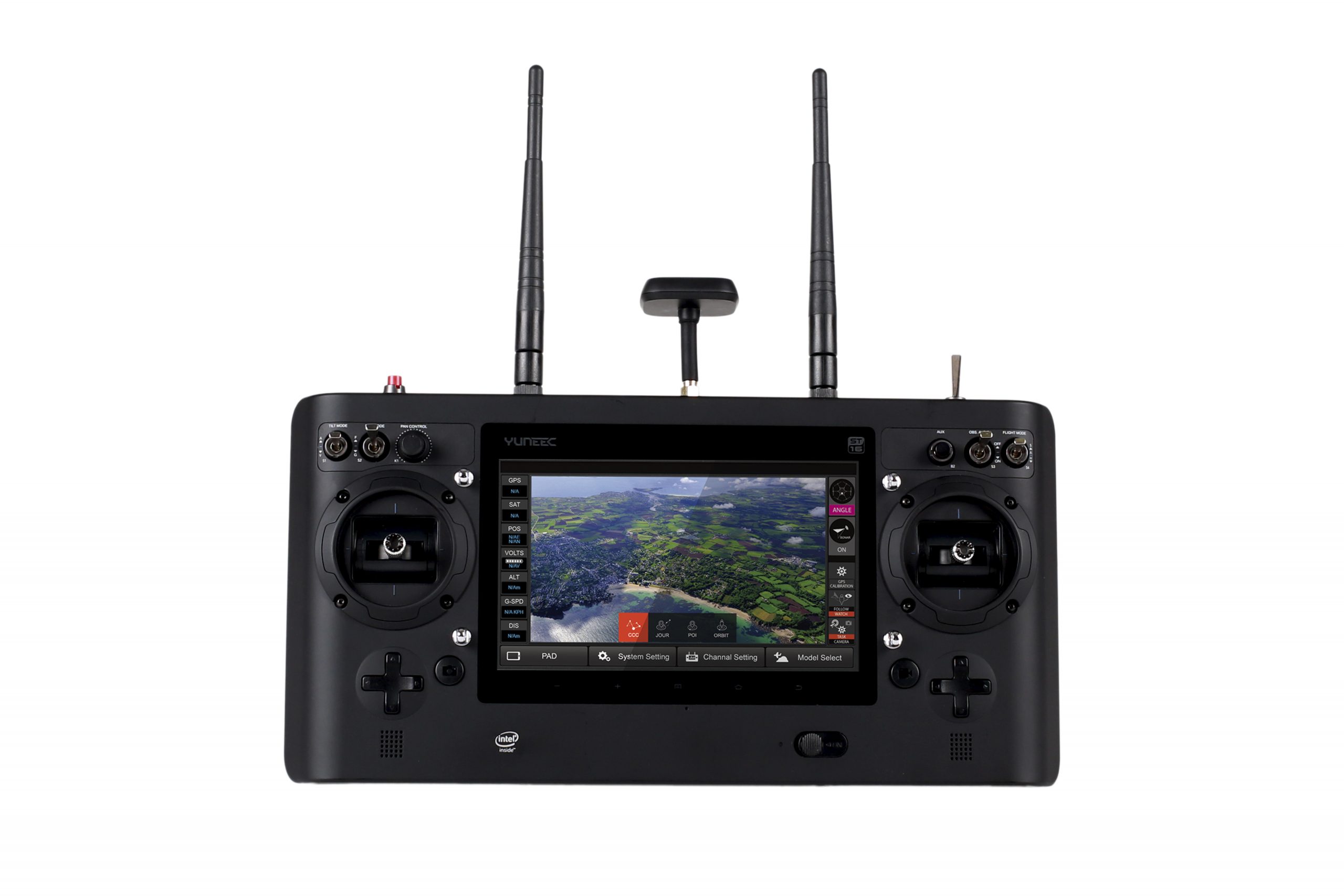 The ST16 Ground Station is an integrated transmitter, receiver and Android platform that gives you full control over Typhoon H, allowing you to easily program autonomous flight and capture stunning photos and videos. The large 7-inch integrated screen displays real-time footage of your flight, eliminating the need for an external device.